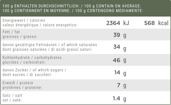 57 % Brotwürfel (Weizenmehl, Palmfett, Salz, Hefe, Zucker); Palmfett, Zucker, Kakaopulver (stark entölt), Aroma