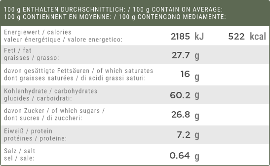 FARINE DE BLÉ, BEURRE, sucre, NOISETTES grillées moulues, cannelle, poudre d’ŒUF, arôme, raisins secs, sel de table, caramel